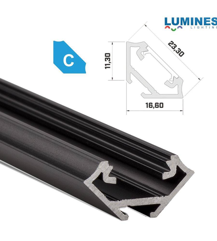 Sarokba rögzíthető, 45°-os keresztmetszetű alumínium profil: olyan helyekre, ahol a ledek süllyesztett szerelése nem megoldható, de mégis szeretnénk ízlésesen elrejteni a fénysort. Szerelhető sík felületre és sarokba egyaránt.