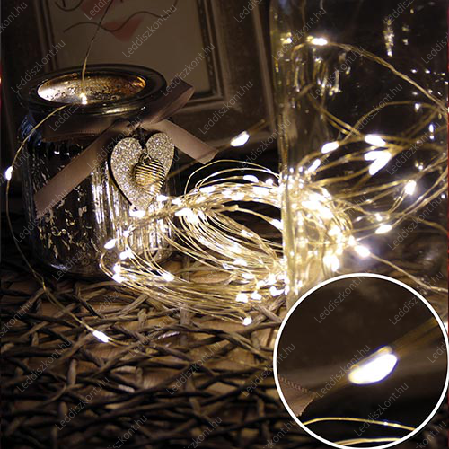 Mikro- Ledes Nano fényfüzér, 100 db diszkrét, kis méretű, meleg fehér leddel, 6/18H időzítővel. Extra vékony, szinte láthatatlan arany színű réz vezeték, 100 led, IP44 vízálló. 30 000 óra. Hossz: 10 m, tápvezeték 5 m. Használható kül- és beltéren, a ledek 4,5 voltosak, fogyasztás 3,6 W. Auto on/off. Az időzítő bekapcsolása esetén 6 órát világít, utána 18 órát nem! Kiválóan alkalmas esküvőkre, bulikra, teraszokra is! Life Light Led 2 év garancia!